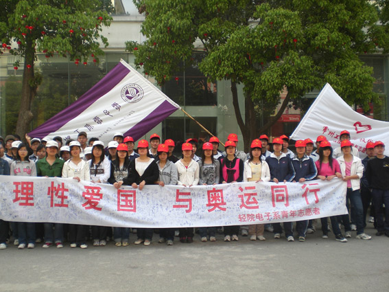 “同一个世界,同一个梦想”北京奥运会将于200888在北京正式开幕了。北京奥运激发了全中国人的爱国热情,常州轻院电子系的青年志愿者为了尽自己的一份力,于426与同在大学城的工程公司志愿者一起,在公司南门举办了一次“理性爱国,与奥运同行”的签名及奥运知识的宣传与调查活动。