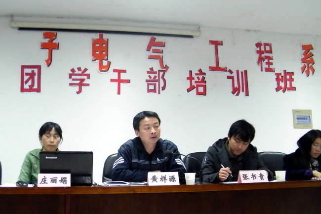 12 月20 日,电子系分团委在教学3201组织开展了电子系团学干部培训班总结汇报大会,系党总支书记庄丽娟,系团委书记韩杨,辅导员张书贵、陈超、于松出席了本次大会。
