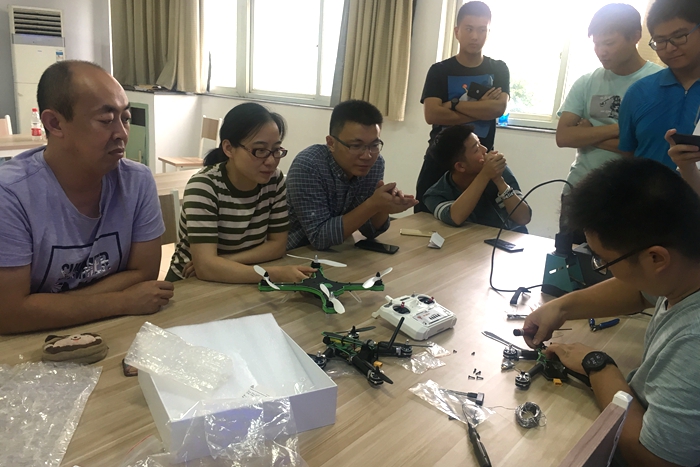 无人机装调技术培训邀请了江苏优埃唯智能科技有限公司两名经验丰富的无人机调试工程师,进行了无人机安装、调试、飞行的系统的技术培训。工程师通过生动、形象的案例分析和现场操作,深入浅出地讲授了多旋翼机长必备的专业知识和技能,并以一种穿越机型为例展示一架无人机从无到有的整个安装调试过程,从小小的螺丝到整个飞行控制面板,从焊接连线到固定旋翼,将每一道工序都细细讲解。培训教师和社团员工通过认真思考、积极参与和动手学习,学习无人机的原理和操作,加深了对无人机行业发展的认识。