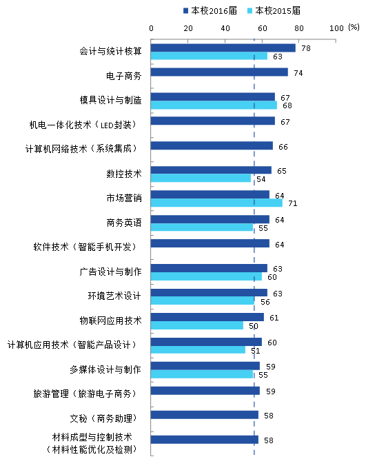 本校2016届工作与专业相关度较高的专业是会计与统计核算(78%)、电子商务(74%),工作与专业相关度较低的专业是新能源应用技术(32%)、国际贸易实务(35%)、高分子材料应用技术(38%)。