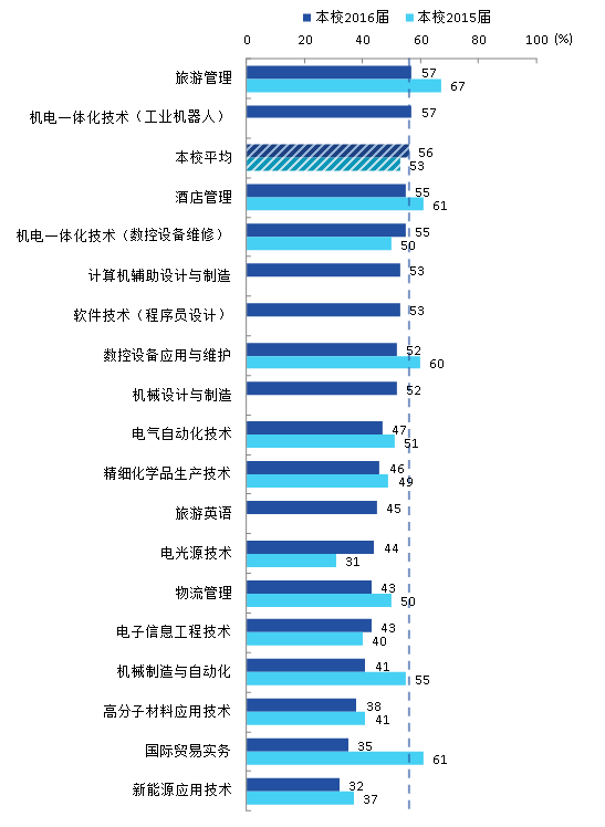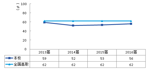 本校2016届毕业生的工作与专业相关度为56%,比本校2015届(53%)高3个百分点,比全国高职2016届(62%)低6个百分点。