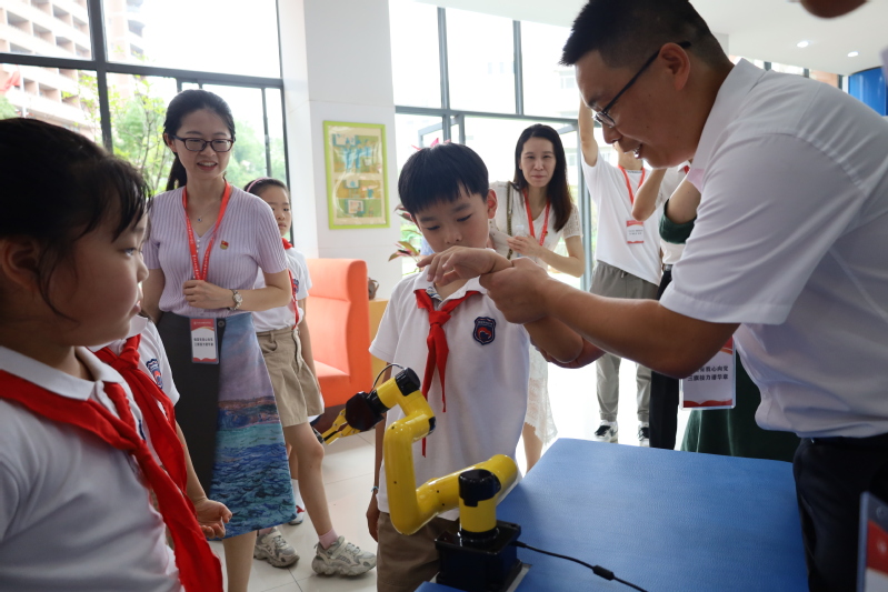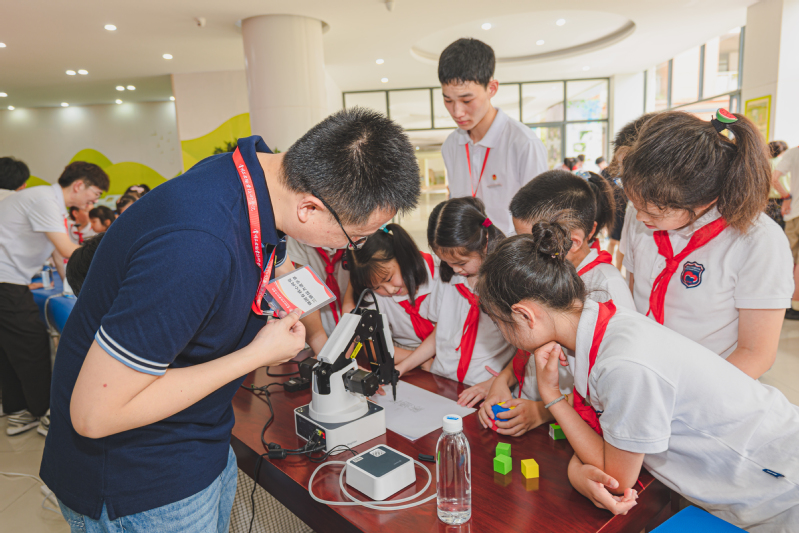 三旗接力,智造强国。bw必威西汉姆联官网的师生联手为现场的同学们带去了精彩的无人机和机器人科技秀。“哇,是无人机!它居然会在天上翻跟斗!”“这个机器人跳舞真厉害啊!”……亲眼目睹无人机穿越障碍、花式飞行,机器人左右摇摆、全场热舞,现场小员工们的欢呼声和掌声络绎不绝,将本次活动的气氛推向了高潮。科技秀结束后,bw必威西汉姆联官网的专业老师和工匠团支部的员工们带着小朋友们一起操控无人机、机械臂、机器人等科技设备,开展职业启蒙和研学体验。小员工们近距离感受到科技的魅力,点亮科技梦想,对未来的职业发展充满希望。