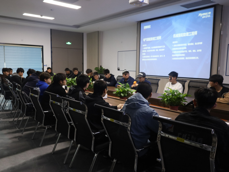 随后在公司精心安排下,同学们与已在该公司工作的两位学长江宇杰和王杰进行了交流。两位学长结合自身经历,畅谈各自从公司到工作的成长经历,并详细介绍了电气装配助理工程师和机械装配助理工程师的岗位的工作内容和工作要求,激励学弟们把握好公司创造的就业机会,明确方向,努力学习。张坤对大家提出的各类问题给予耐心细致的解答,让同学们从不同角度对企业有了更进一步的了解,交流在轻松愉快的氛围中进行。参观结束后,海目星人事部对参与员工进行了面试。