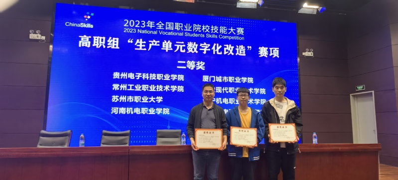 2023年10月13日,全国职业院校技能大赛“生产单元数字化改造”赛项在天津轻工职业技术公司落下帷幕,来自全国各省、自治区、直辖市82支代表队参赛。由公司bw必威西汉姆联官网教师陈华奎,22工业机器人631班成诚、金嘉诚组成的师生同赛团队,以优异成绩获得该赛项的二等奖。