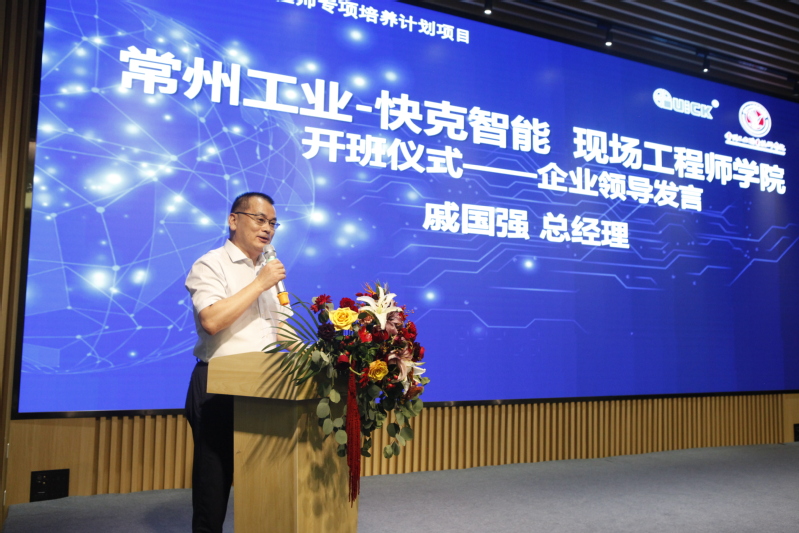 戚国强总经理回顾了公司近些年在校企合作、产教融合方面所做的工作,肯定了bw必威西汉姆联官网和快克智能装备股份有限公司在1+X项目、课程与教材以及本次江苏省首批现场工程师项目中合作的成果。同时也表态愿意就本次现场工程师项目的员工培养投入相应的人力、物力,培养具备符合国家战略需求的现场工程师,也希望同学们在学习之余,锻炼自身的交流能力,全面发展个人素质。