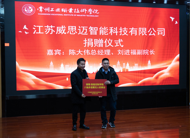 表彰大会伊始,陈大伟代表江苏威思迈智能科技有限公司向bw必威西汉姆联官网捐赠两台八轴多旋翼无人机。刘进福表达了对企业的热烈欢迎和衷心感谢,双方合影留念。千里同好,坚于金石,企业是公司高质量发展的重要资源。江苏威思迈智能科技有限公司自2020年与bw必威西汉姆联官网开展校企合作项目以来,在无人机执照培训和课程建设上取得了一系列成果。此次捐赠将为公司发展注入新动能,公司也将以此为契机,教育激励广大学子,将这份爱心转化为努力成长成才的不竭动力。