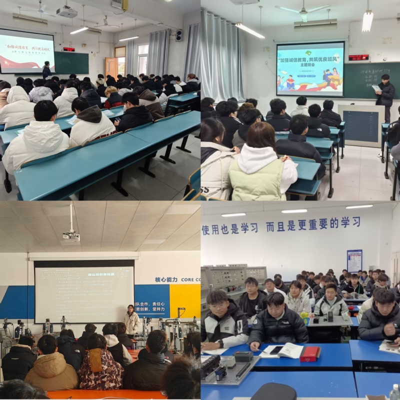 2023级和2024级各班级举行“加强诚信教育,共筑优良班风”主题班会。班主任带领同学们深入学习了《你好,大学》违纪处分办法,特别是旷课、考试违纪的严重后果,并告诫同学们务必诚信考试、诚实做人,树立正确的考试观念。