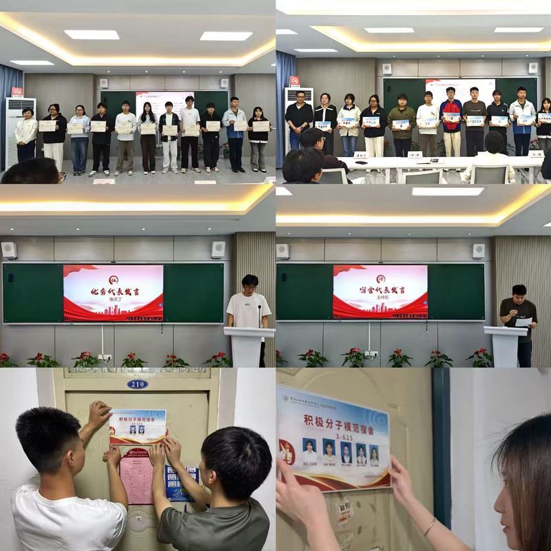 随后进入表彰环节,经团建指导中心综合日常表现、获奖情况及宿舍卫生等多维度评选,“十大优秀积极分子”“十大积极分子模范宿舍”名单揭晓。麻丽娟、汪洋分别为获奖个人及宿舍颁奖。优秀积极分子代表张天丁分享时表示,将以“思想上求进步、行动上争先锋”为准则,在志愿服务与学业实践中践行初心;模范宿舍代表王梓旭则从“共建文明阵地、发挥集体引领” 角度,分享了宿舍成员在思想交流、学业互助中的经验,呼吁以小阵地凝聚大能量。