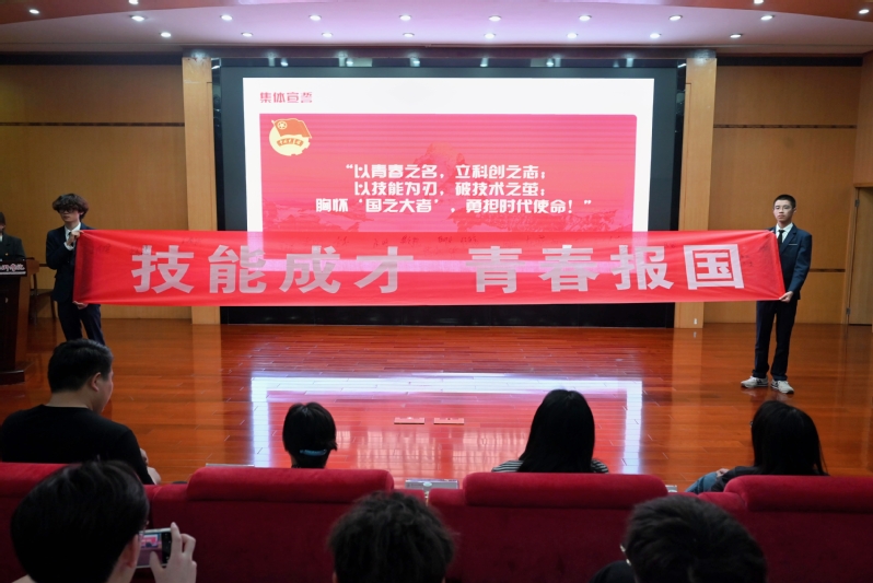“以青春之名,立科创之志;以技能为刃,破技术之茧……”全体同学起立宣誓,字字铿锵。在“技能成才・青春报国”横幅签名环节,青年们以笔墨铭刻担当。校团委副书记涂艳群表示:“此次示范性团课通过真实案例与互动实践,让‘核心技术自主创新’的信念深植青年心中,这正是新时代技能报国的生动诠释。”