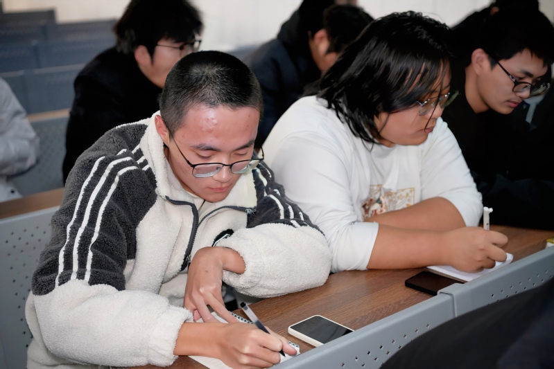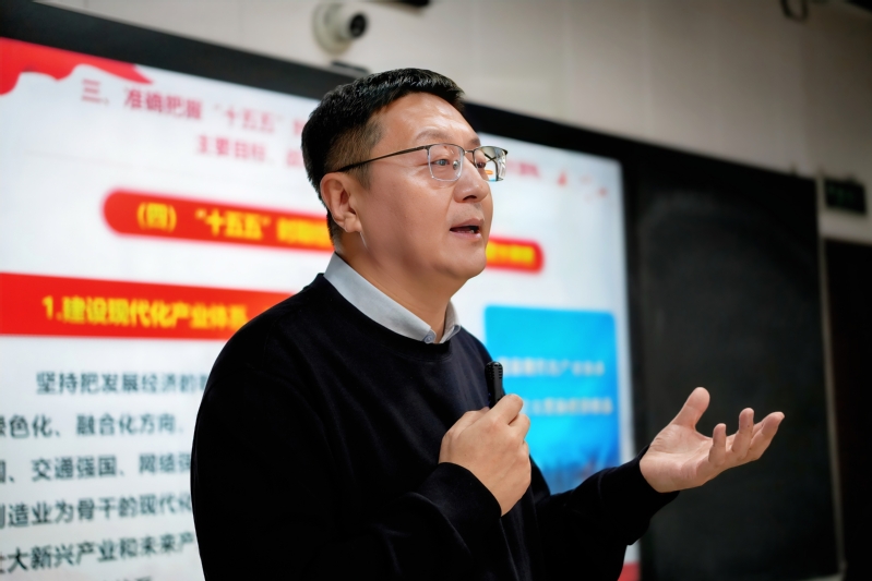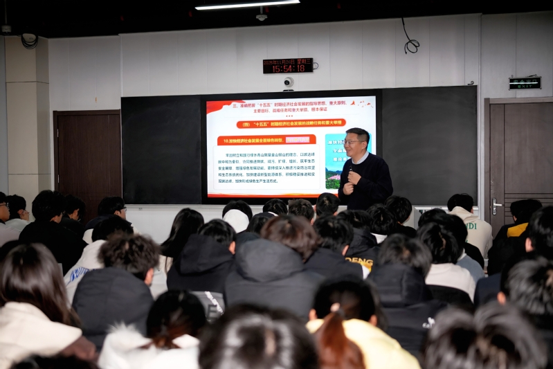 王老师从“十五五”规划建议的战略定位、核心内容和青年使命三个方面,系统解读了党的二十届四中全会精神。他重点讲解了“六个坚持”重要原则(坚持党的全面领导、坚持人民至上、坚持高质量发展、坚持全面深化改革、坚持有效市场和有为政府相结合、坚持统筹发展和安全)和“建设现代化产业体系“加快高水平科技自立自强”等核心任务,引导同学们深刻理解“十五五”规划对青年成长的时代意义。