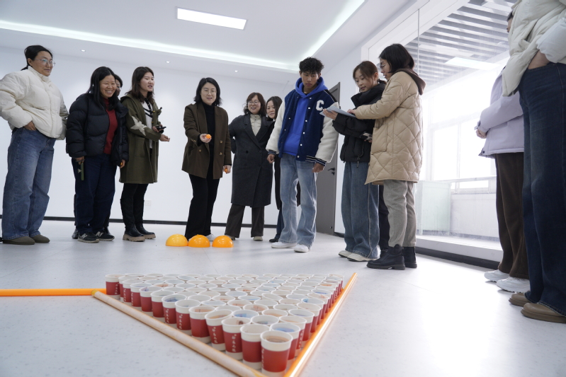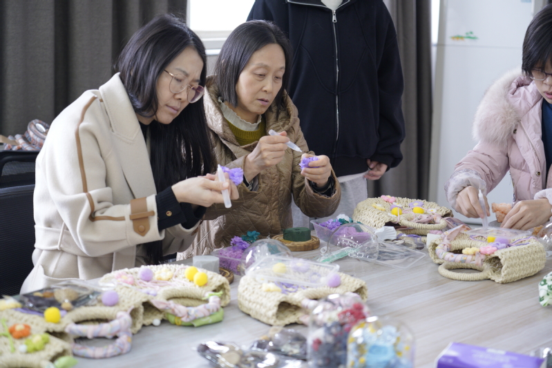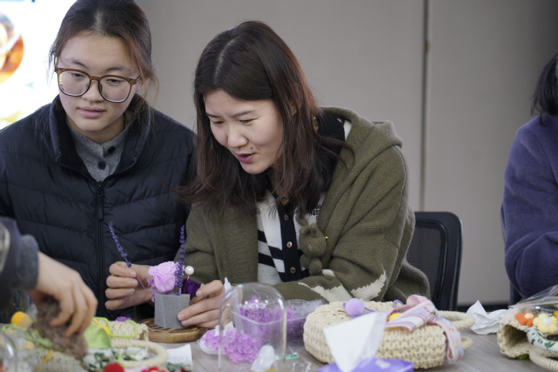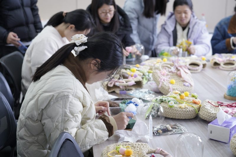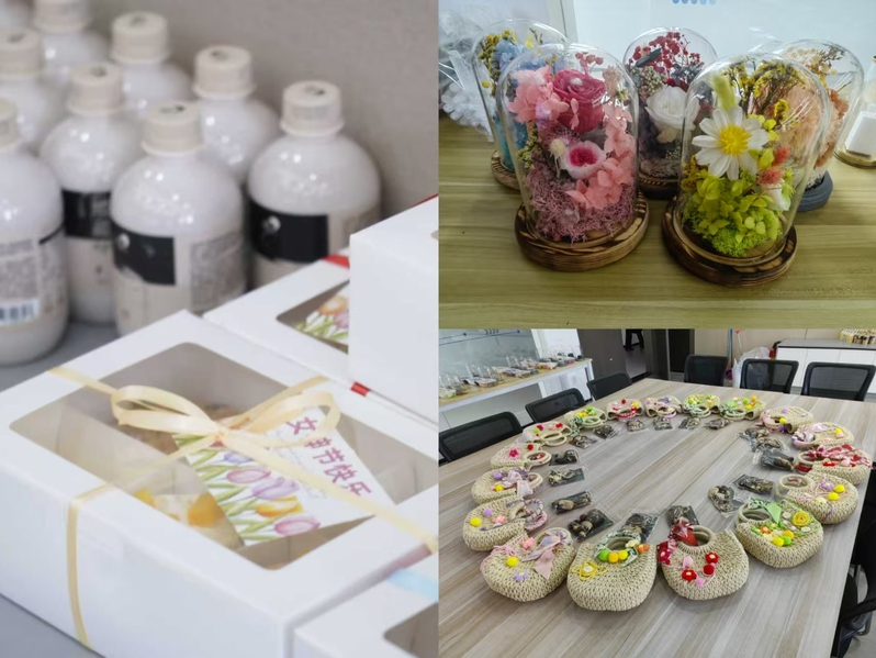 本次活动设置了永生花 DIY、手串果壳风铃制作、杯中有喜投掷游戏三大趣味环节,同时特别增设暖心手工项目,员工们亲手为老师们制作编织包,以指尖匠心传递真挚敬意。在永生花 DIY 区域,大家精心搭配花材、组装摆件,将春日美好定格在玻璃罩中,每一件作品都独具匠心;手串果壳风铃制作现场,师生们穿珠、挂饰、组装,清脆的铃声与欢声笑语交织,亲手打造出充满自然意趣的小挂件;“杯中有喜” 投掷游戏更是将气氛推向高潮,参与者瞄准纸杯、精准投掷,在趣味互动中收获惊喜与快乐。