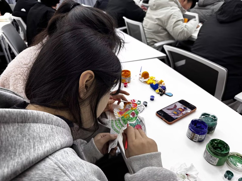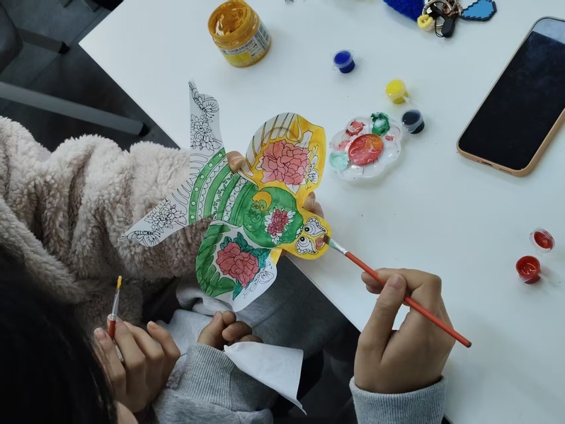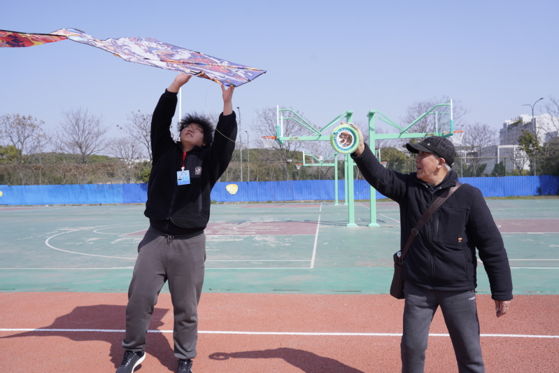 手绘风筝环节是本次活动的亮点之一。同学们、关工委老教师与教职工子女围坐在一起,携手创作、其乐融融。大家以素鸢为纸、以彩笔为媒,将国风元素、青春寄语、家庭温情、美好愿景一一绘于风筝之上。一只只创意十足、色彩斑斓的风筝在大家手中逐渐成型,每一笔都饱含心意,每一幅作品都承载着美好期盼。